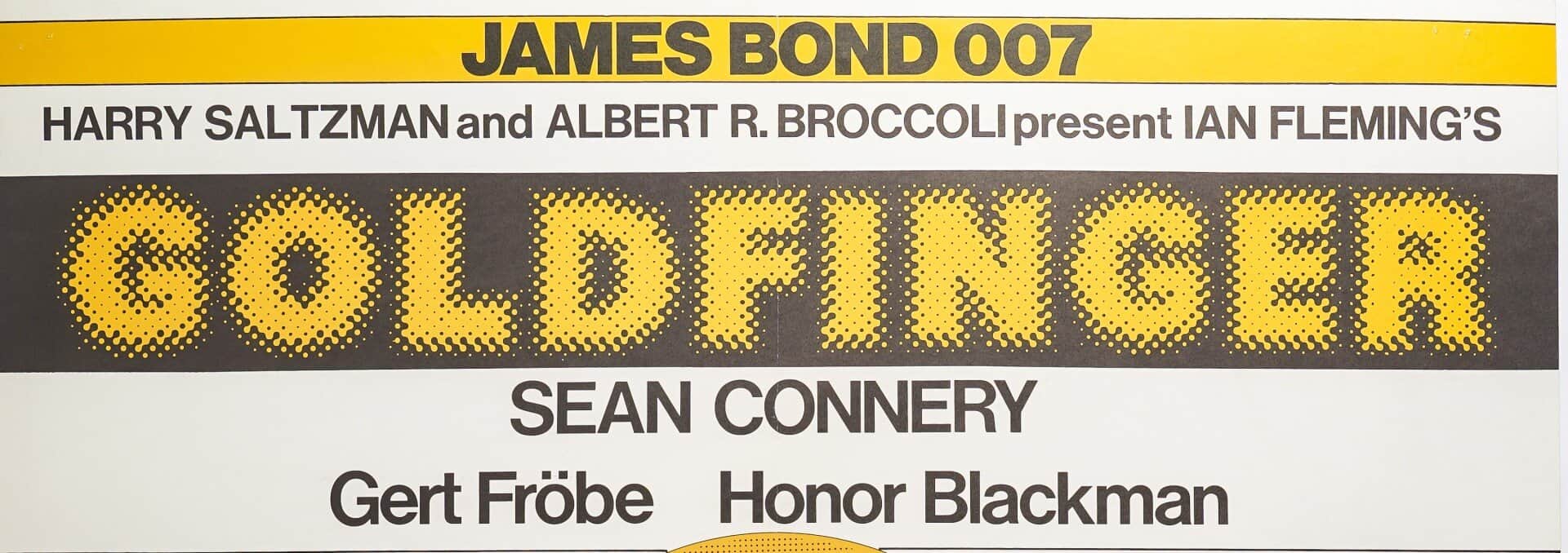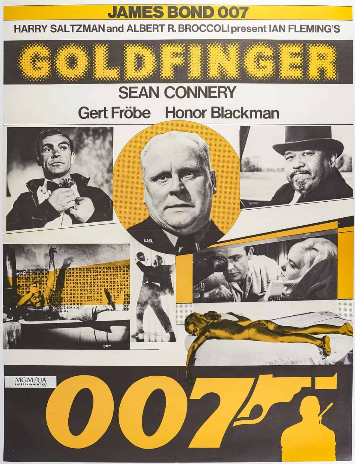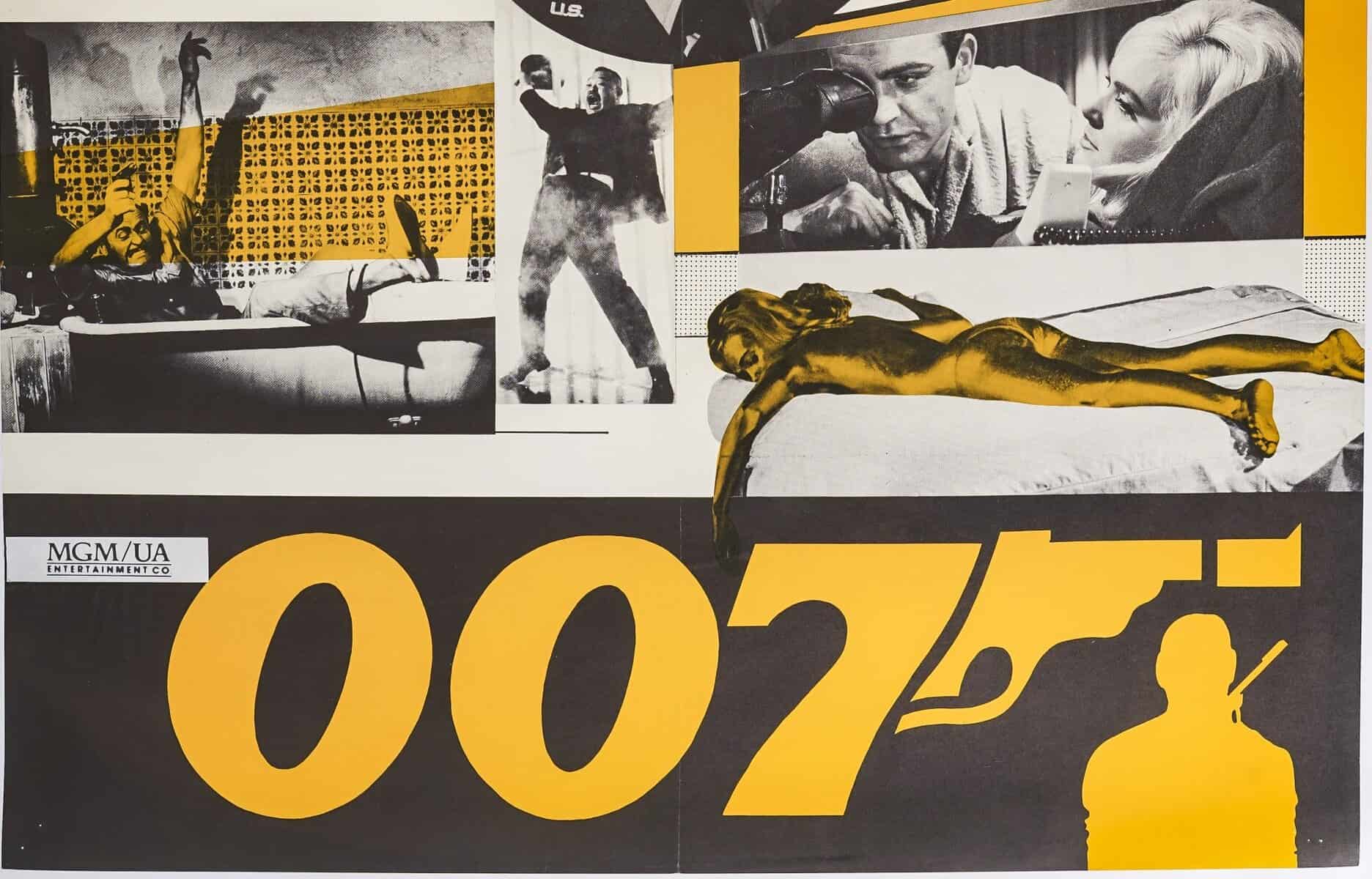 – ainsi que plusieurs scènes emblématiques : une femme entièrement recouverte d’or, un combat, une baignoire, et Bond aux côtés d’une femme.