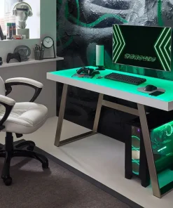 Vous rêviez d’un bureau RGB, alors le voici. Avec son plan de travail de 140 cm, vous pourrez y déposer votre tour d’ordinateur ainsi qu’un écran et vos périphériques PC. Cette description convient plus aux jeunes joueurs de jeu vidéo, mais ce bureau convient tout autant à une personne qui souhaite une table de travail RGB offrant un plateau design en verre et un piétement en acier simple et non encombrant pour pouvoir y placer vos jambes aisément.