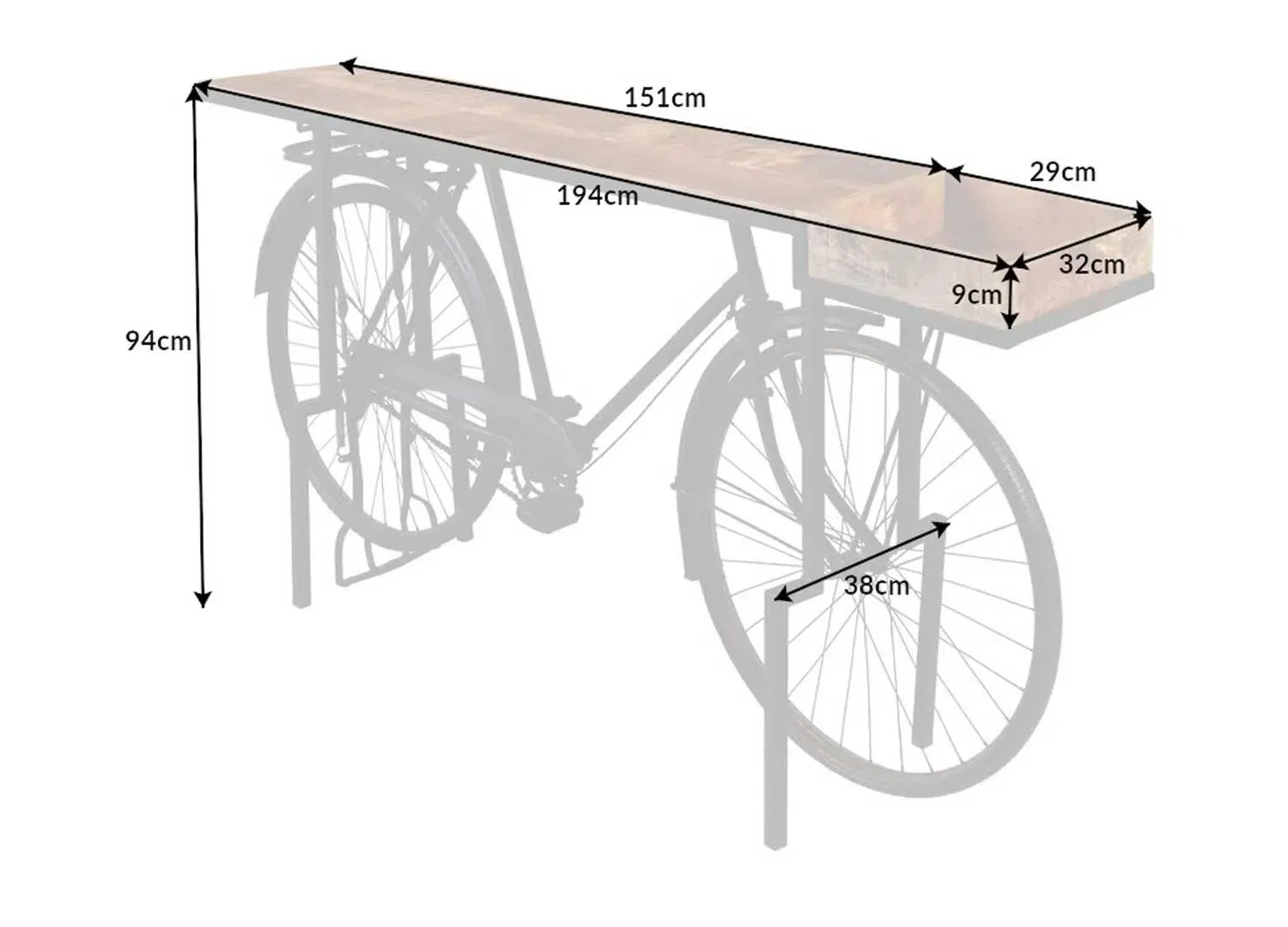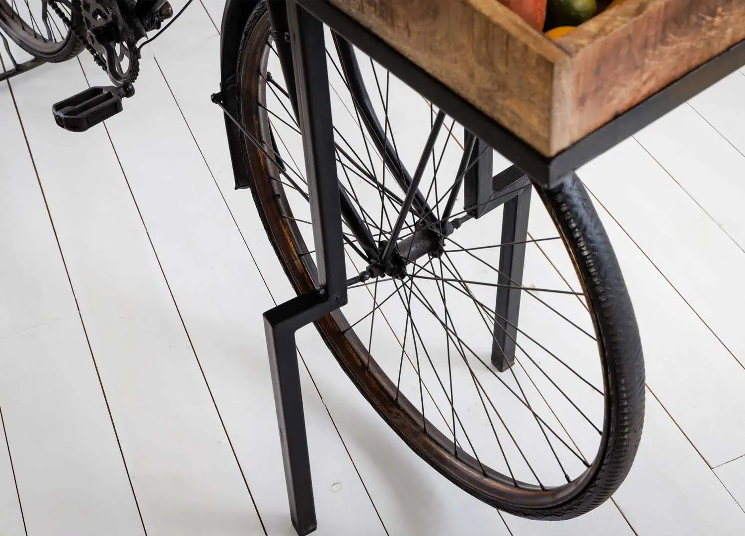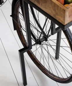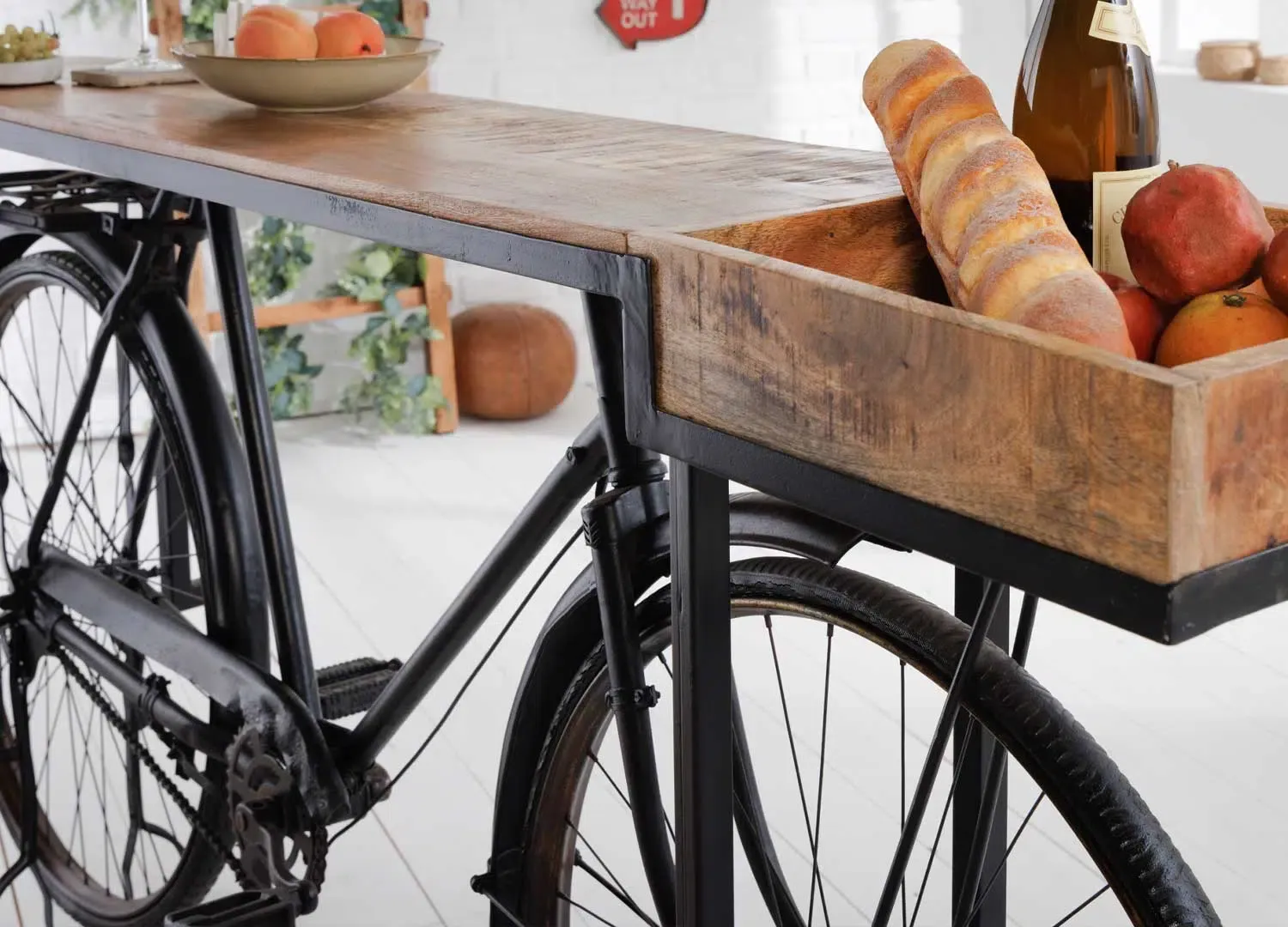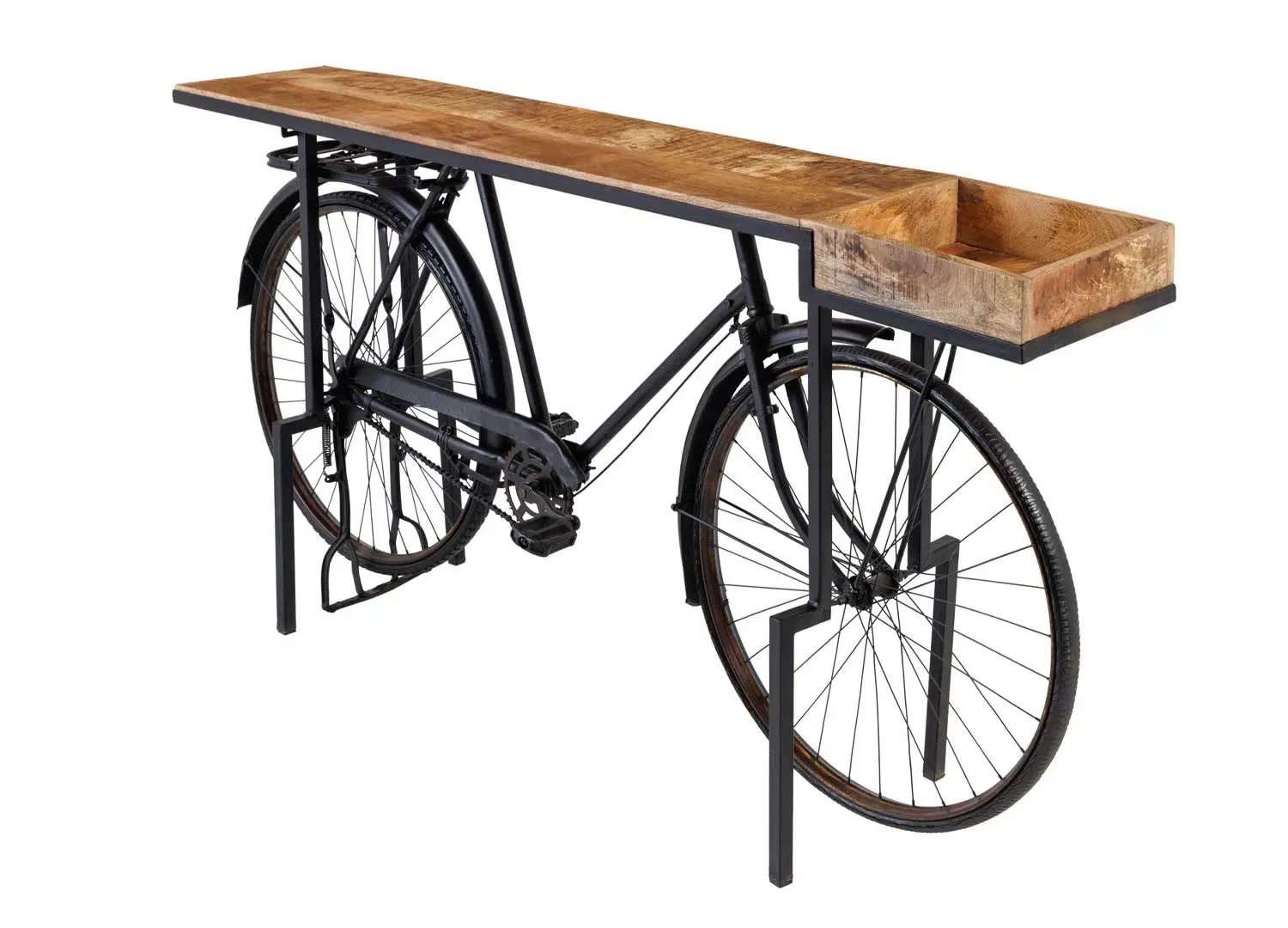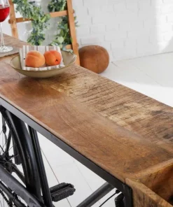 Console vintage en bois de manguier et vélo en métal noir recyclé
