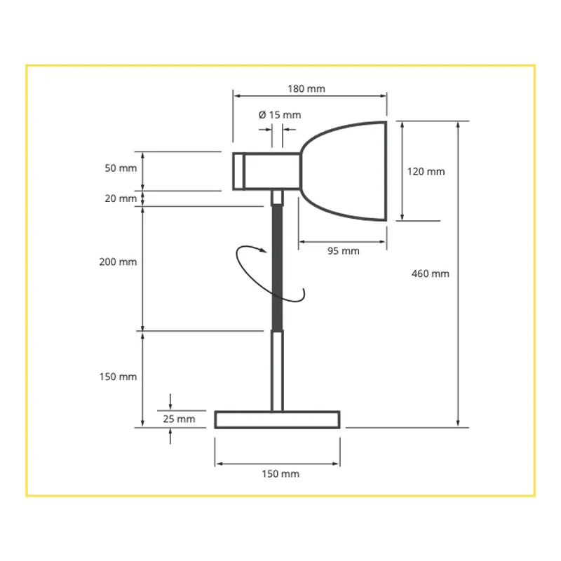 - Largeur du pied : 15 cm. Une partie du pied est fixe (hauteur env. 15 cm), le reste est flexible et permet d’orienter la lampe à votre convenance