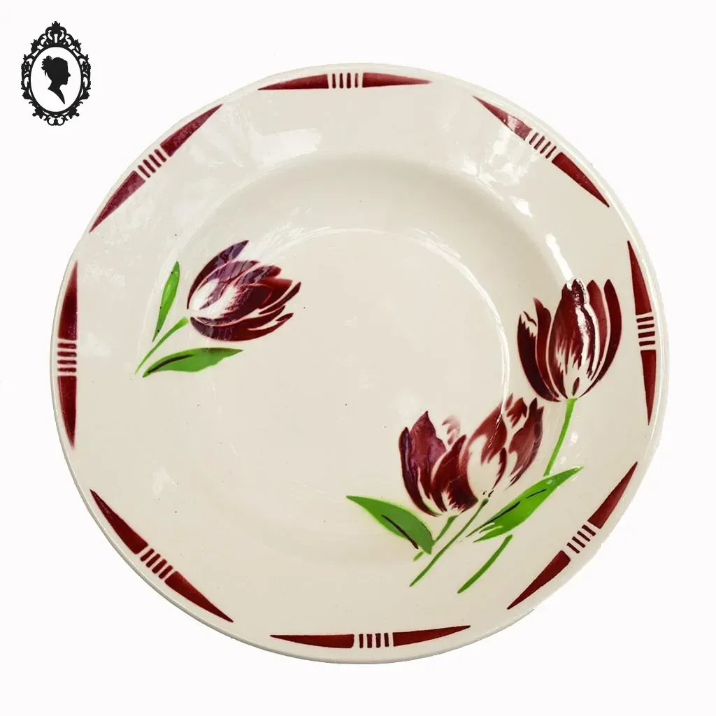 L’intérieur de l’assiette présente trois belles tulipes avec son feuillage vert.