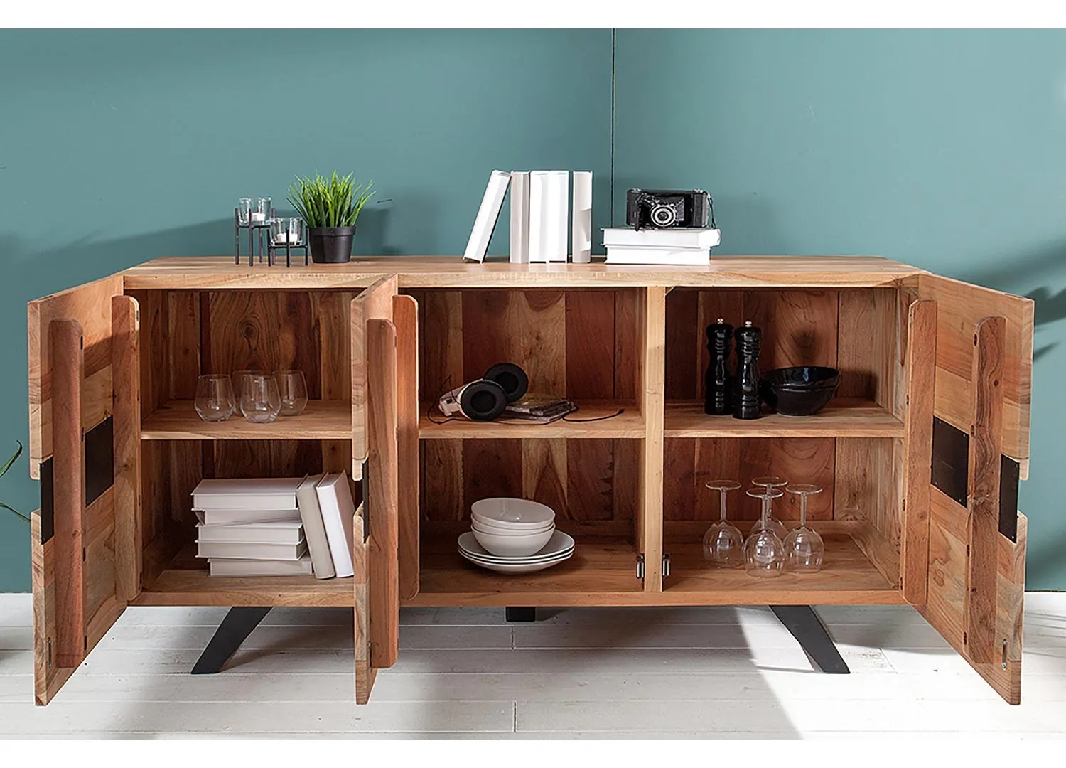 Ce meuble buffet en bois massif avec pieds et plaques décoratives en métal noir, aux courbes épurées, permettra un rehaussement du style moderne industriel dans votre salle à manger. Ce buffet en bois d’acacia s’accordera parfaitement avec les autres meubles en bois et métal noir de la même collection afin de créer un intérieur harmonisé.