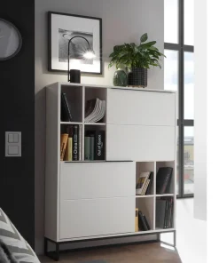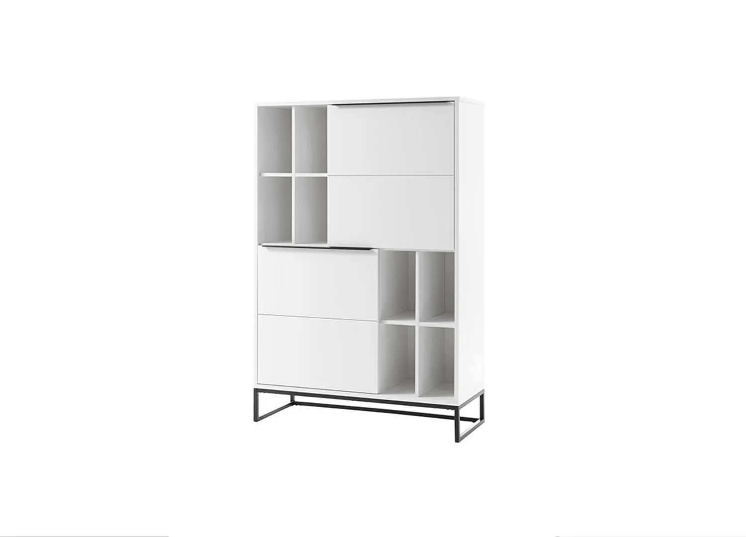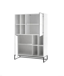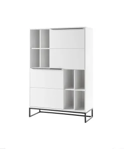 Un meuble buffet haut de 149 cm de hauteur de finition blanc laqué mat disposant de 2 portes et de 8 compartiments ouverts. Vous pourrez y placer des livres ou des décorations si vous souhaitez les mettre en valeur. Les compartiments fermés pourront accueillir tout type d’objet de salon ou salle à manger. Un intérieur design reposant sur des meubles blanc laqué mat de qualité n’est pas négligeable. Aménagez votre salon ou séjour avec ce beau meuble buffet haut au design contemporain.