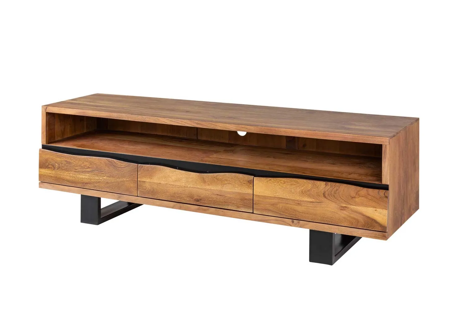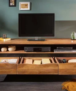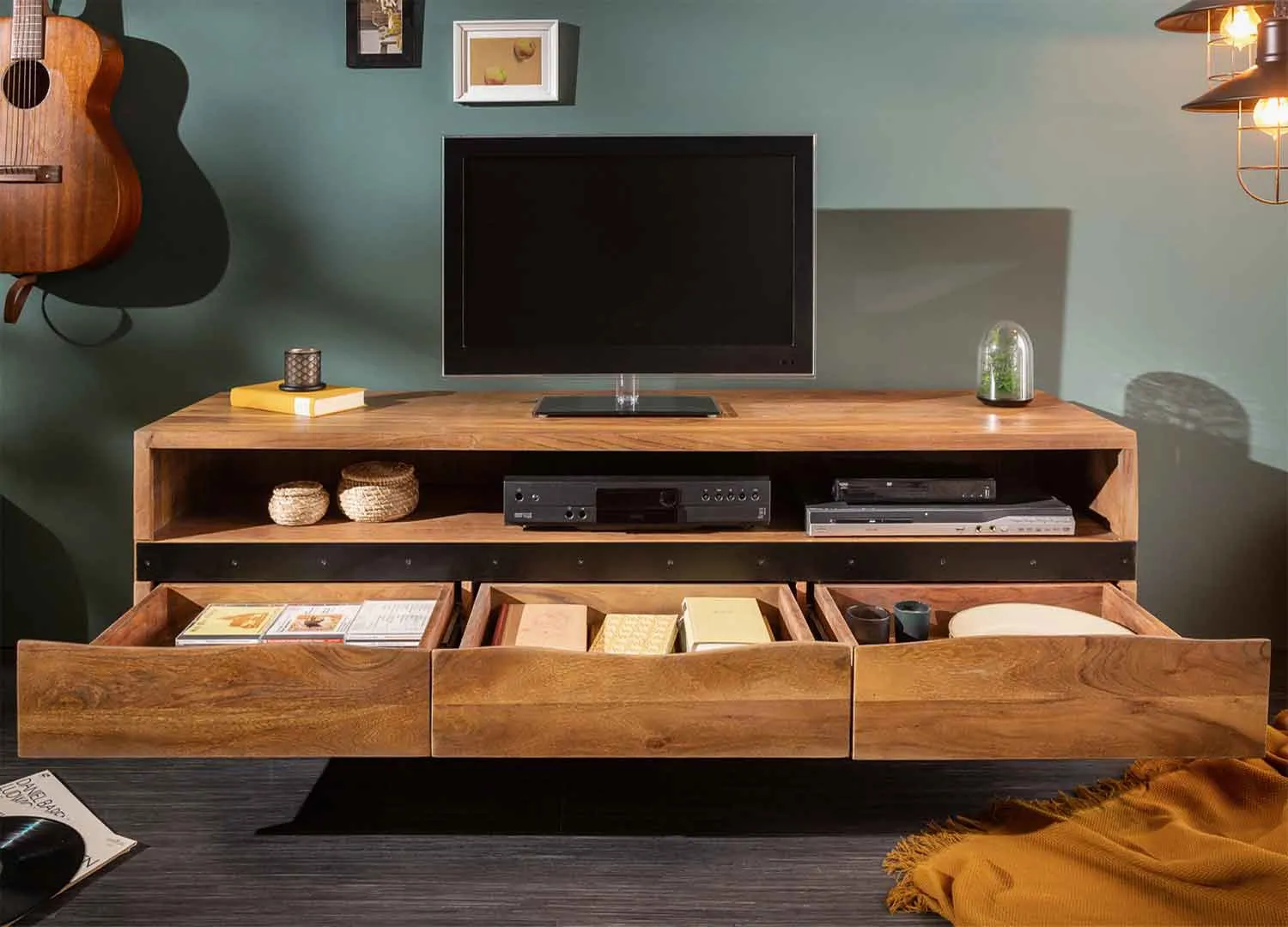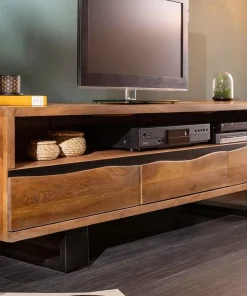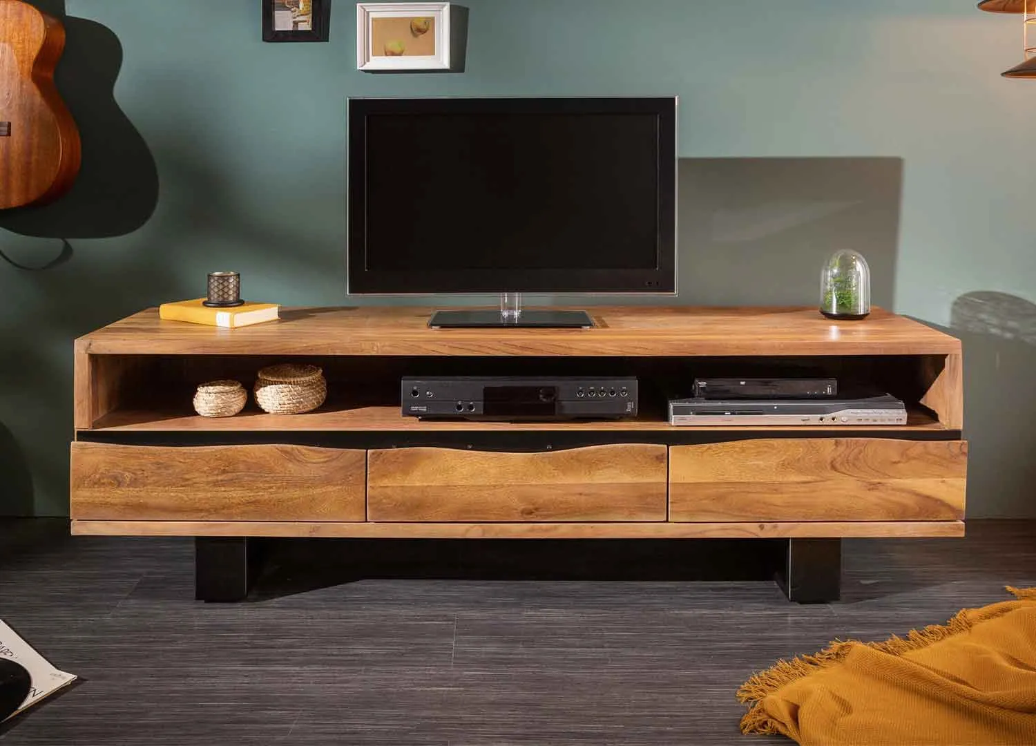 Ce solide meuble TV est visuellement attrayant, avec une finition de haute qualité et est fonctionnellement bien pensé. Tous les appareils multimédias et l’équipement nécessaire se positionneront dans la niche de rangement ouverte. Des tiroirs de rangement vous seront également pratiques pour ranger les télécommandes, bouquins ou encore manettes de jeu vidéo. Un meuble TV en bois d’Acacia massif qui ne manquera pas de vous satisfaire.