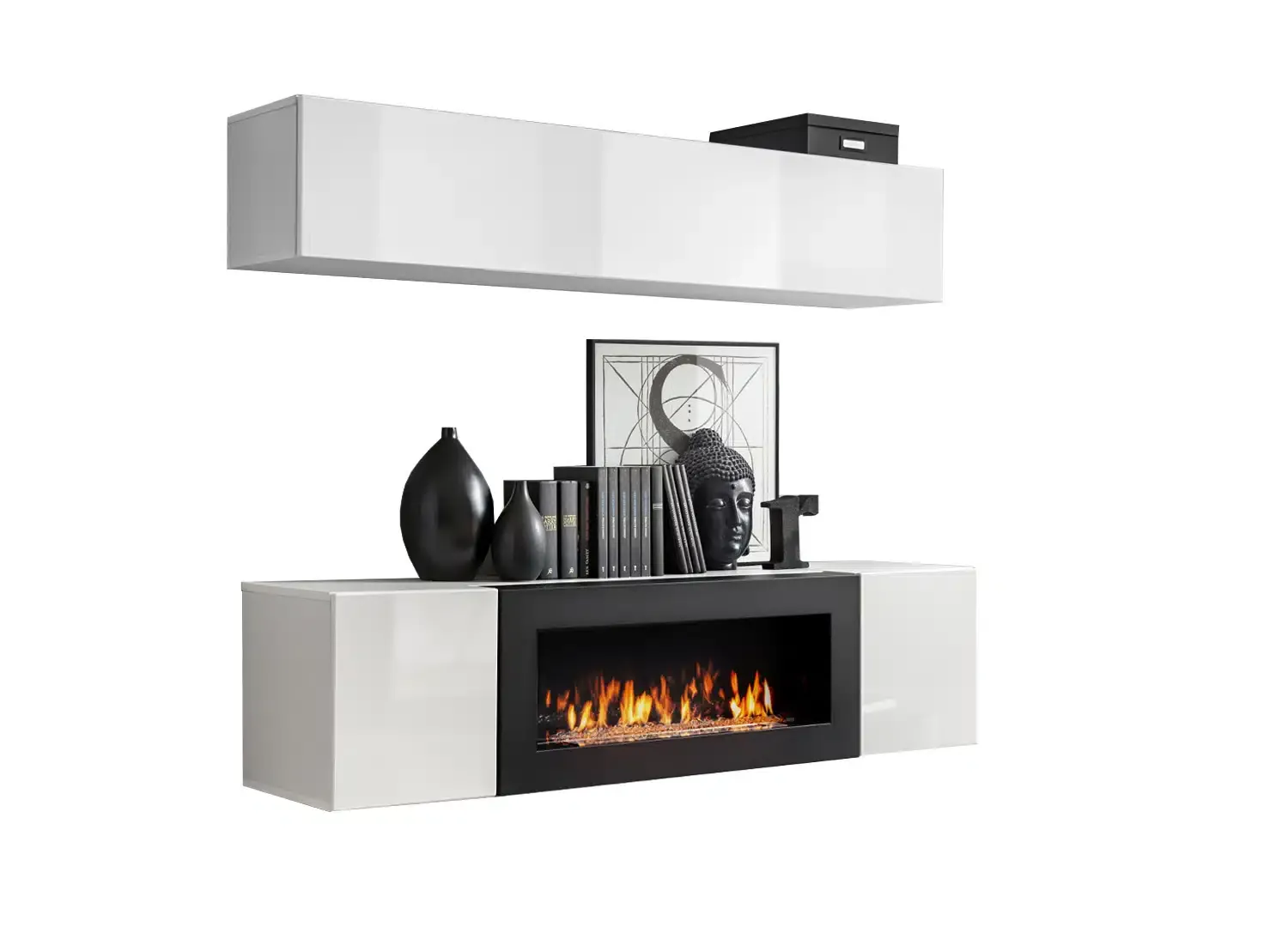 Meuble TV mural 160 cm avec cheminée décorative bio éthanol