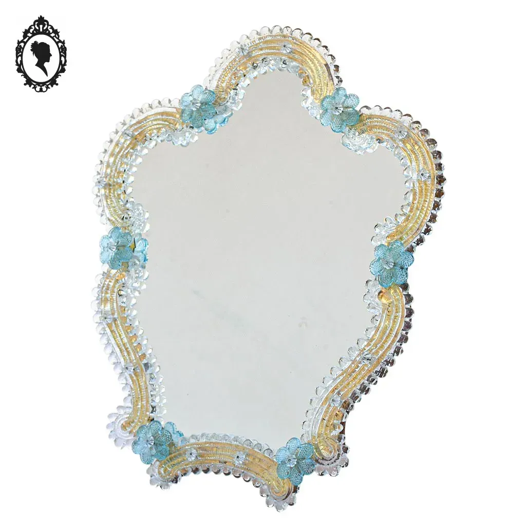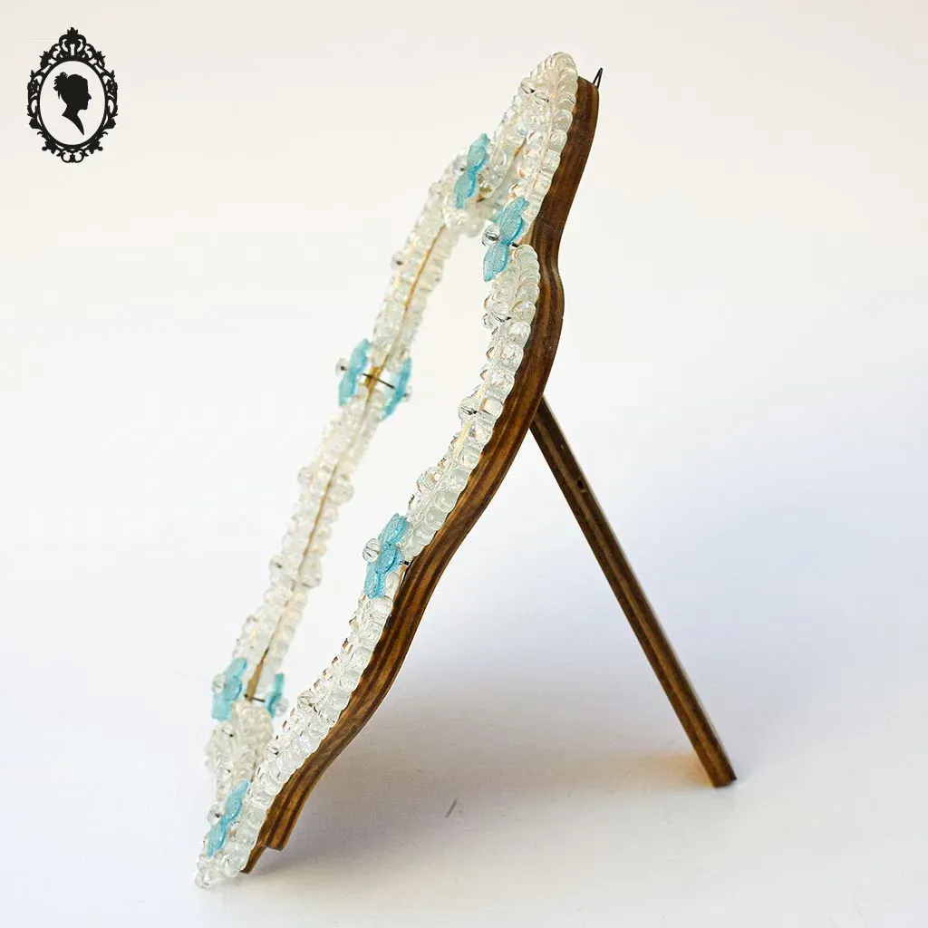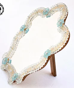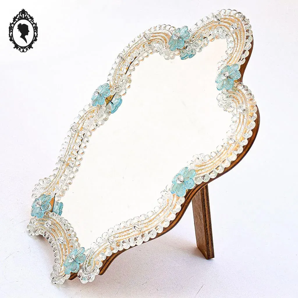 Miroir, miroir romantique, miroir charme, miroir shabby, miroir chic, miroir vénitien, miroir Murano, verrerie italienne, verrerie Murano, verre de Murano, miroir verre, miroir sur pied, psyché, psyché à poser, miroir à poser, miroir raffiné, miroir élégant, miroir bleu, miroir de table, miroir mural,