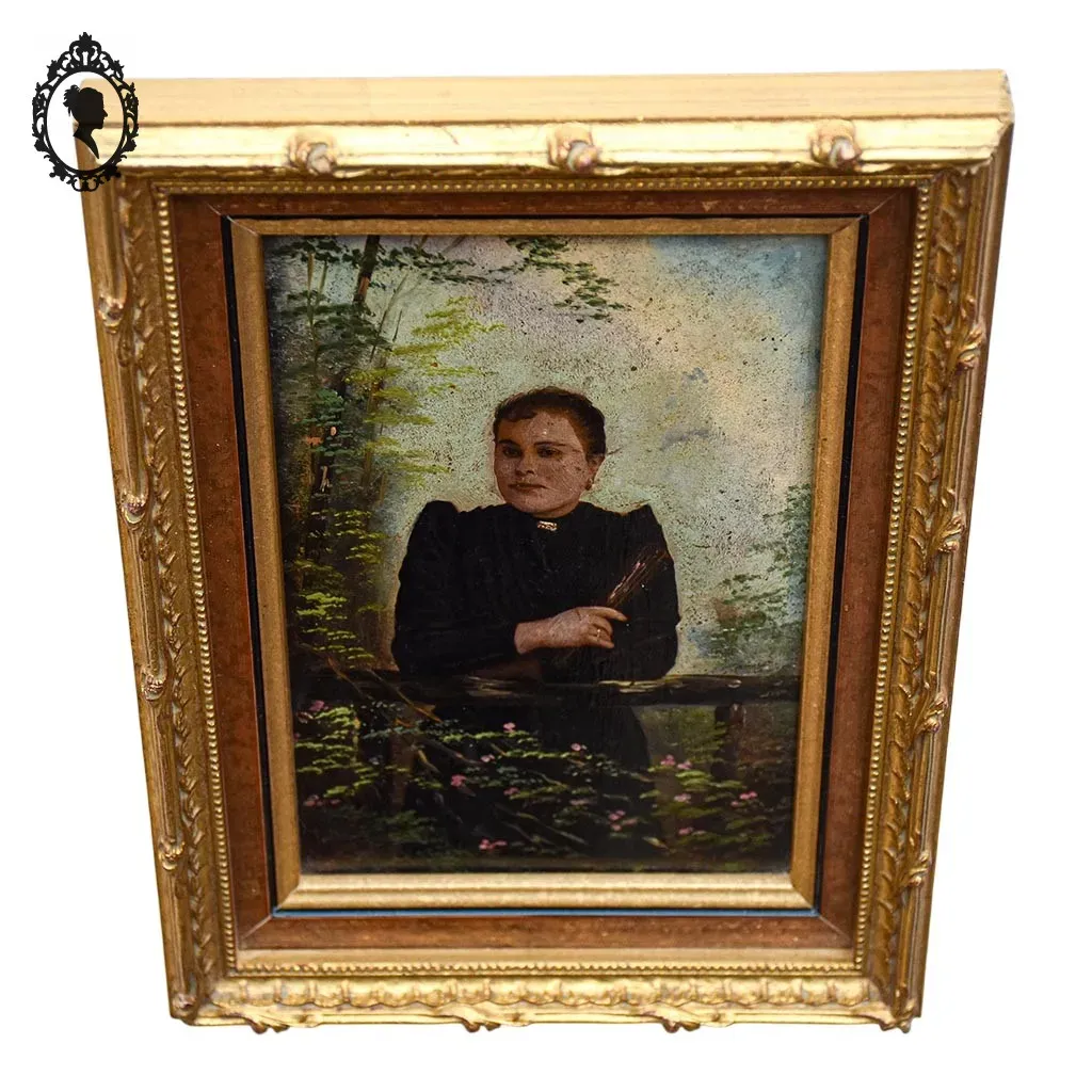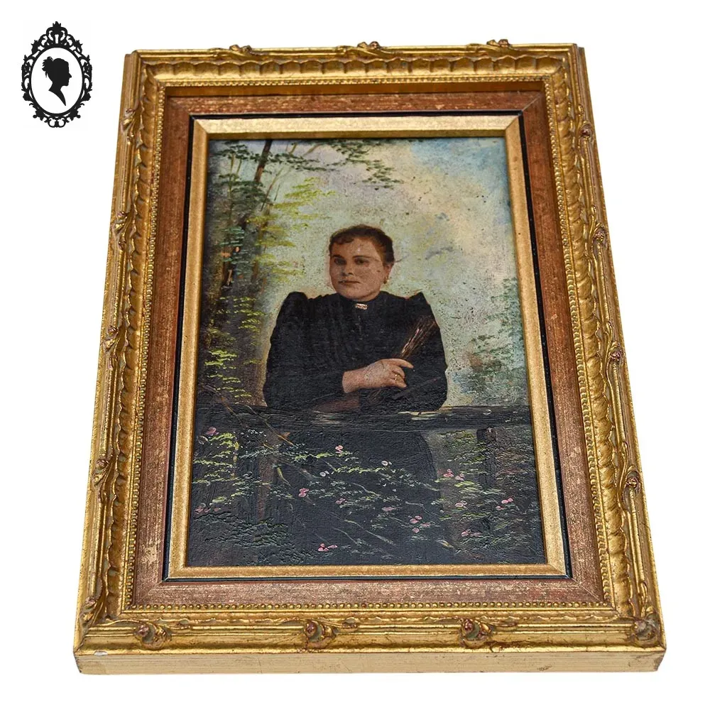 Portrait huile, peinture, peinture portrait, peinture XIX, portrait XIX, Décoration romantique, brocante chic, cadre doré, cadre ancien, petit cadre, décoration élégante, objet XIXe, miniature dans cadre portrait, huile tableau,