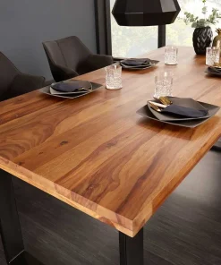 Cette table de repas est une excellente addition à tout espace de salle à manger. Cette table est fabriquée en bois de sesham massif, réputé pour sa durabilité et son grain riche. Elle est disponible en quatre tailles différentes pour répondre à vos besoins spécifiques : 120cm, 140cm, 160cm, ou 180cm. Son piétement en U en métal noir ajoute une touche moderne au design traditionnel du bois. Ce piétement unique, de style industriel, offre un contraste saisissant avec la beauté naturelle du bois. Cette table est non seulement fonctionnelle, mais aussi esthétiquement plaisante, ajoutant une touche élégante et contemporaine à votre salle à manger
