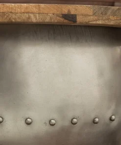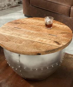 Une table basse ronde avec pied en métal comprenant des rivets soudés, pour un design original et industriel. La table est en métal robuste afin d’avoir une solidité imparable. Son plateau en bois massif de Manguier a l’aspect de planches légèrement ondulés pour un style unique et flatteur.