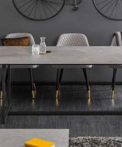 Une table repas de rectangulaire avec une longueur de 200 cm pour y accueillir environ 8 couverts. Un plateau en verre et céramique reposant sur un piétement noir de style industriel ajoutent du charme à votre séjour. La couleur gris béton de la table à manger reste sobre et élégante aux côtés de chaises de salle à manger d’une couleur proche.