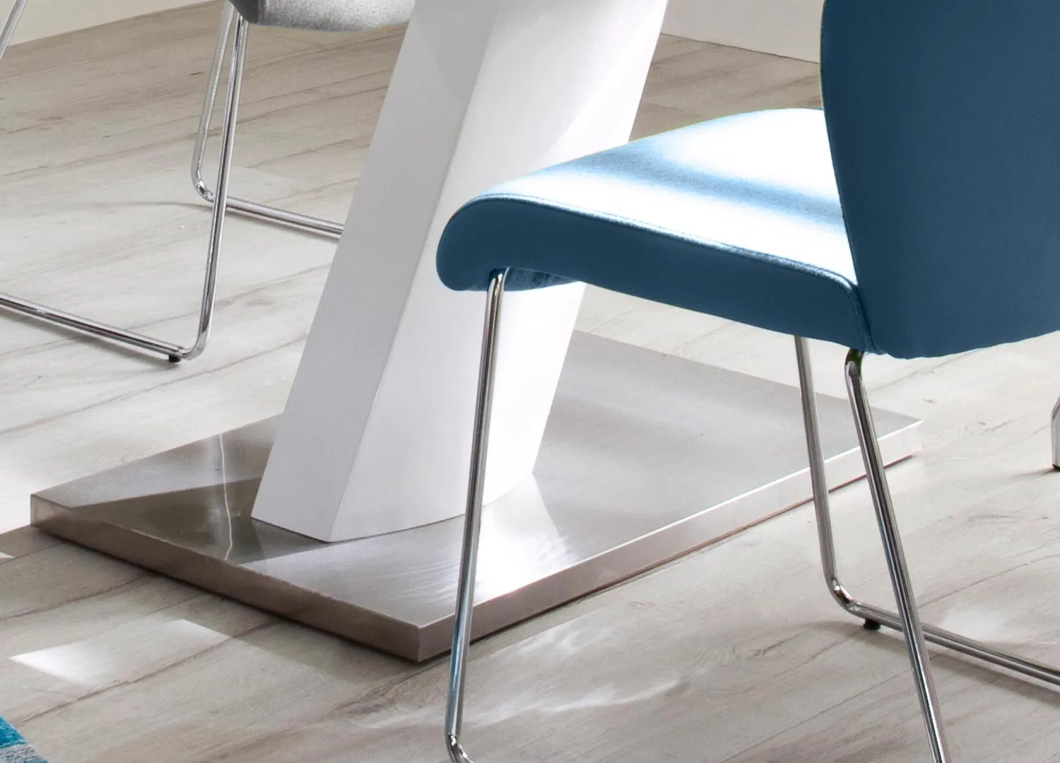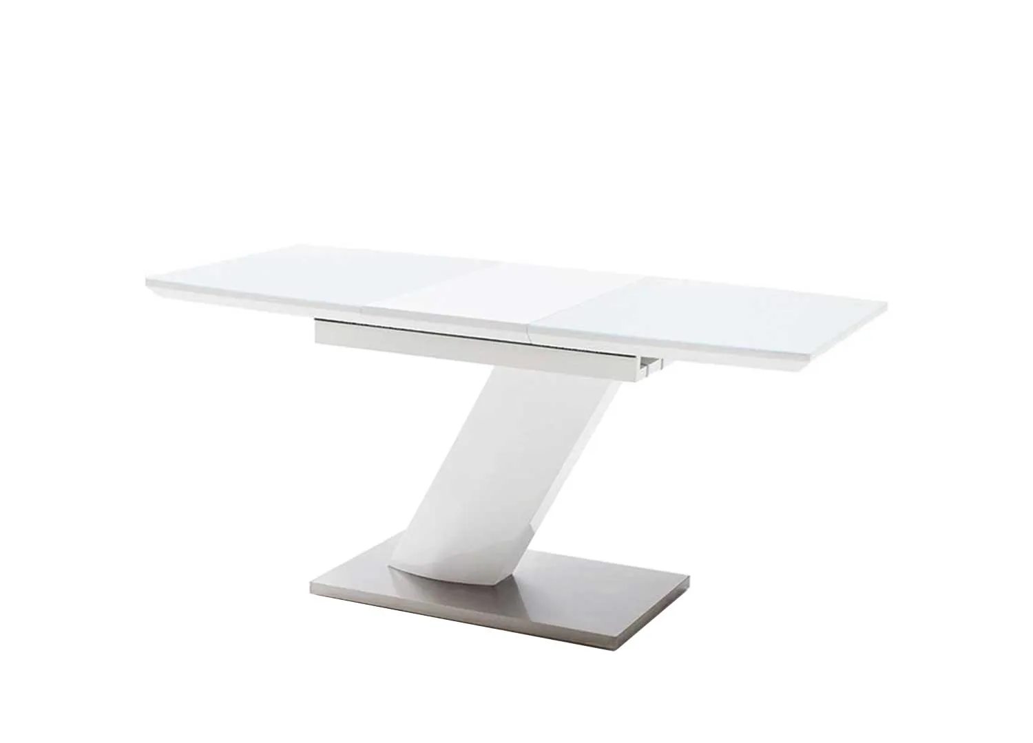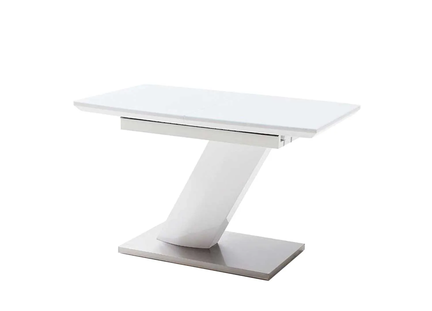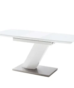 Une table de repas en bois laqué blanc possédant un plateau recouvert d’un verre blanc avec ouverture centrale pour ainsi effectuer la mise en place de sa rallonge. Cette table est disponible en 2 longueurs permettant d’assurer de 4 à 8 couverts. Son socle principal en acier brossé permet un équilibre parfait de la table. Cette table repas extensible blanche laquée a un vrai design moderne, avec son pied blanc laqué brillant incliné, cette table s’insert facilement dans une salle à manger épurée. Le verre trempé blanc disposé sur la table est un verre trempé SECURIT assurant une protection parfaite envers le risque de casse de la table.
